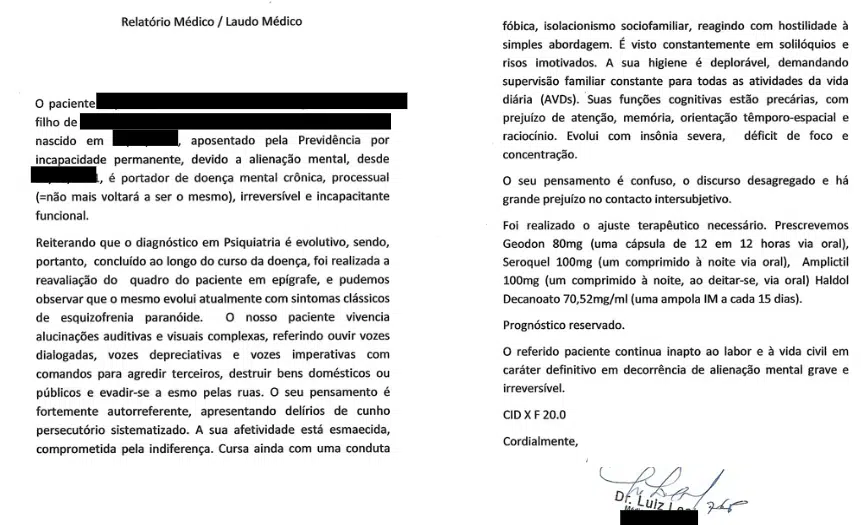 - Deve ter laudo médico com CID da alienação mental e detalhamento do quadro clínico.